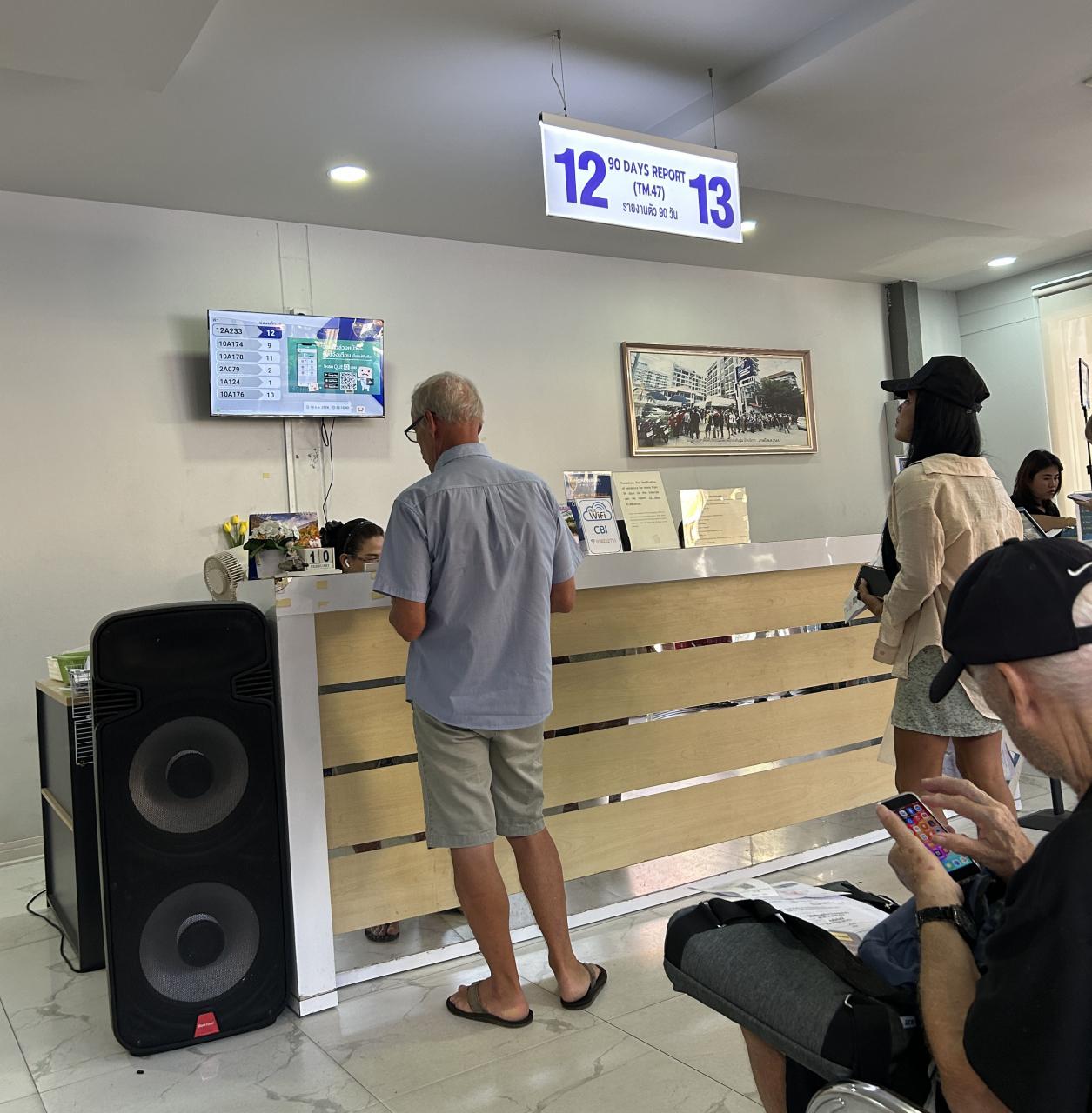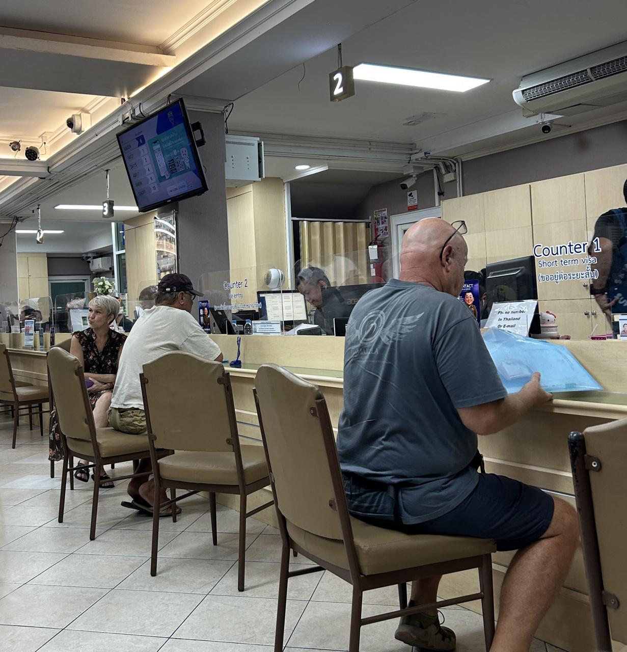 前日に銀行関連の書類は既に入手して、この日は朝8:10にイミグレに到着しましたが、既に、事前書類チェックの整理券は86番、各カウンターの整理券を配布する事前書類チェックの待合室は70人で満席で、事前書類チェックを受けるための整理券を待合室の外で配布していました、凄い混みようで、事前チェックまで約50分待ちで、母屋に入り、リタイアメントビザ更新のカウンターNo8の整理券はたったの3人待ちでした。持参した書類で問題なくカウンターでは所要はたったの3分程度、顔写真と取って、更新料の1900Bhatを支払って完結いたしました。滞在時間は1時間15分ぐらいでした。明後日パスポートを回収と序でにリエントリーパーミットを申請いたします。他の方も言っている様に、多分午後2時ごろ来るのが、割と空いていて効率的の様です。 -