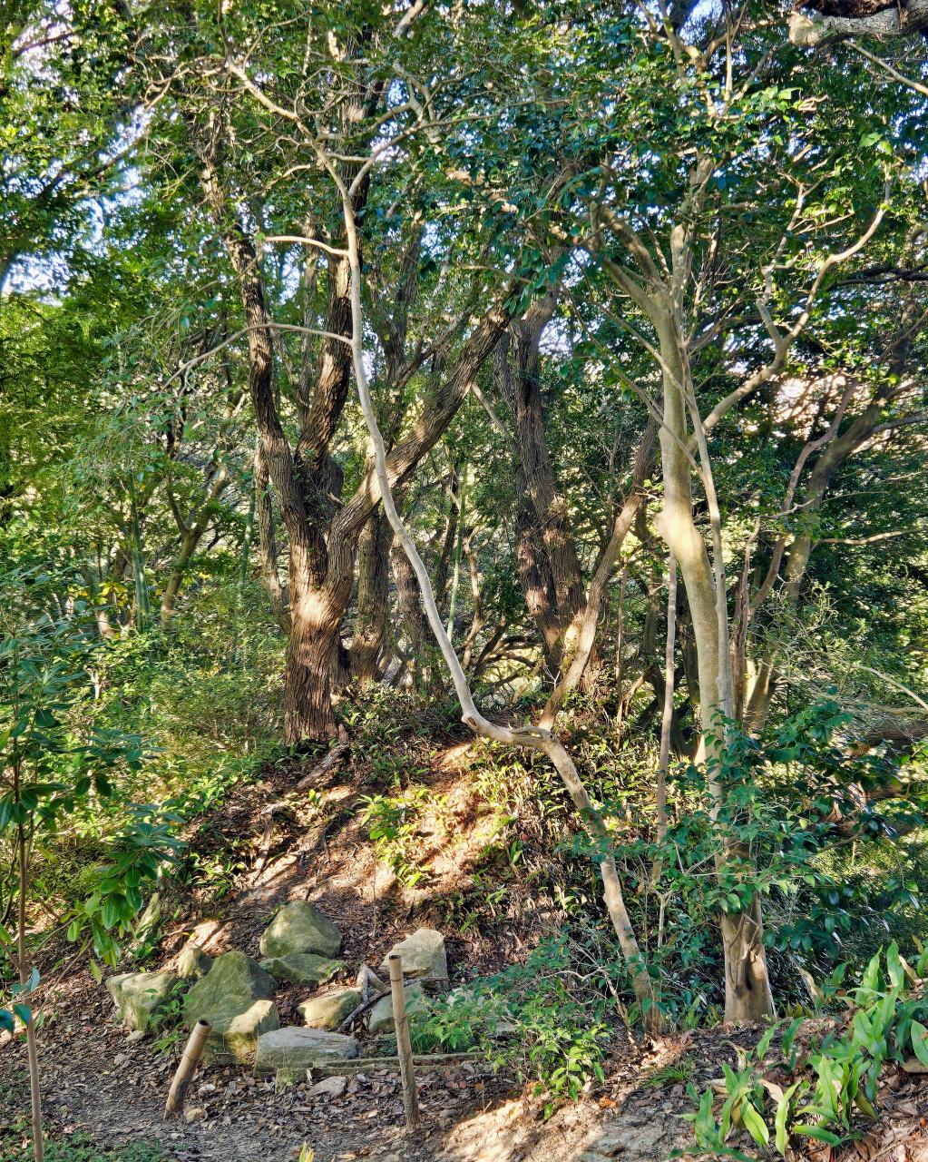 社殿とは反対側にも小山になった崖地があり、ウバメガシなどが群生しています。