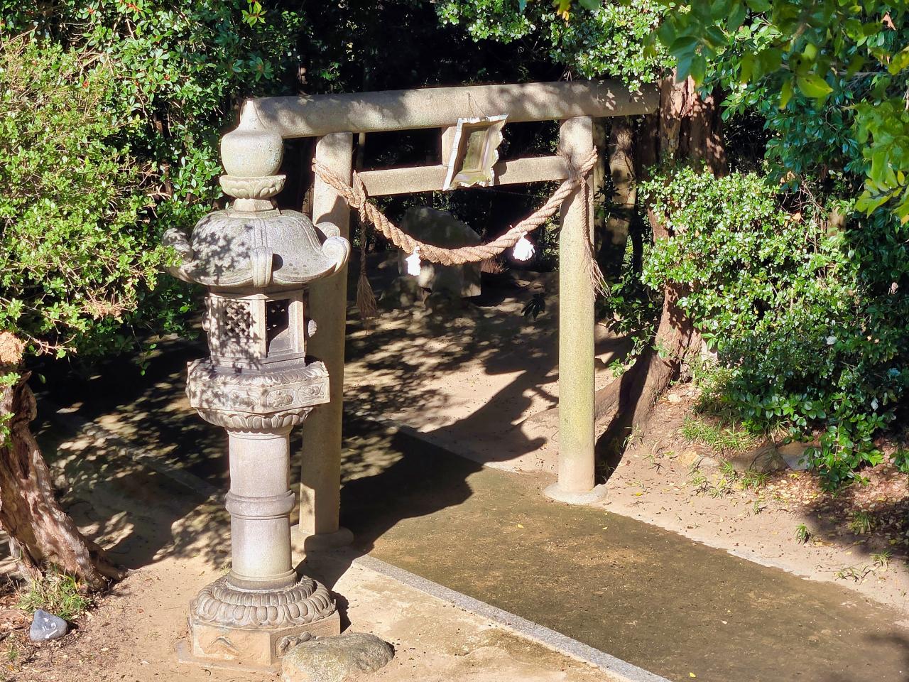 階段状の坂を下りると、背の高い石灯籠1基と、石造りの神明鳥居が立ち、土を踏み固めたような参道が続いています。石鳥居は、柱と笠木が円柱状で、貫は板状で、太めの注連縄が弛ませて掛けられてます。
