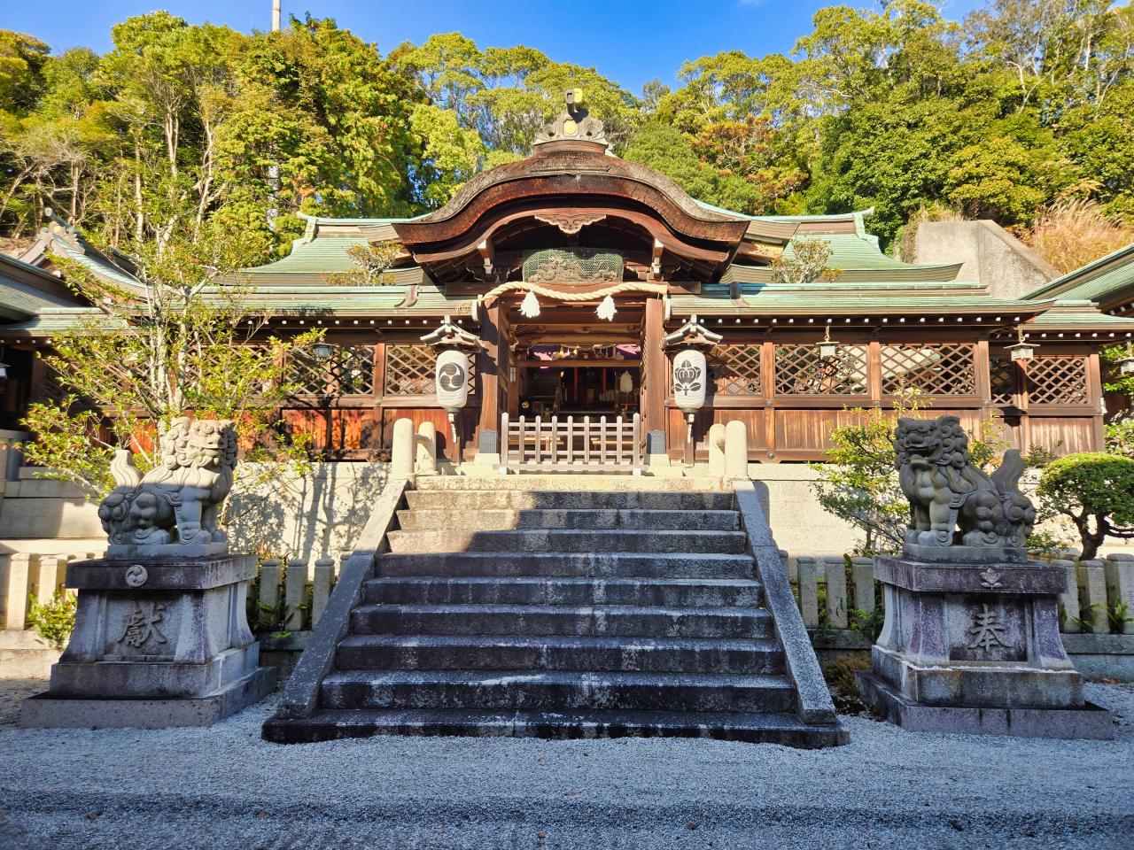 本殿は軒唐破風付きの社殿で、祭神は誉田別命(応神天皇)です。神紋は、左側の提灯には八幡宮に一般に見られる「左三つ巴紋」が、右側の提灯には石清水八幡宮でも使われている「橘」が、それぞれ使われています。