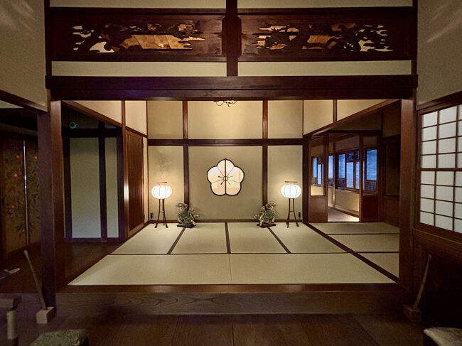 宿泊した客室【早蕨】は,登録有形文化財『眠雲閣落合樓 眠雲亭』2階の客室。「眠雲亭」の各客室(「紅梅」「常夏」「浮舟」「早蕨」「松風」「桐壺」)には,源氏物語に因んだ桐板透彫欄間が用いられています。