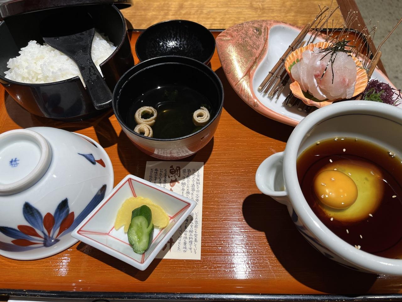 見た目より鯛の量は多いけど、卵かけごはんの印象の方が強いかも。かどや 松山空港店 グルメ・レストラン
