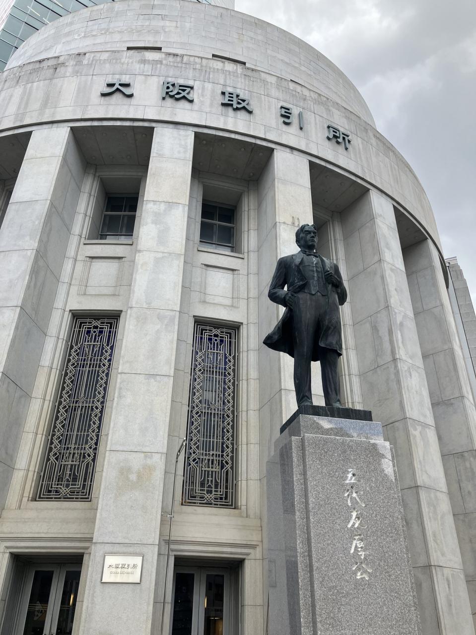こちらの銅像は五代友厚で、取引所の新ビル完成時2004年に作られたらしい。大阪取引所 名所・史跡