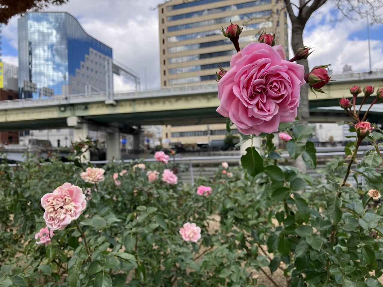 まんぷくベーカリーで買ったパンをランチにバラもまばらな中之島バラ園のベンチでぼんやり。無風で程よい寒さの中、都会のサラリーマン気取りで過ごすのは中々愉快な体験。