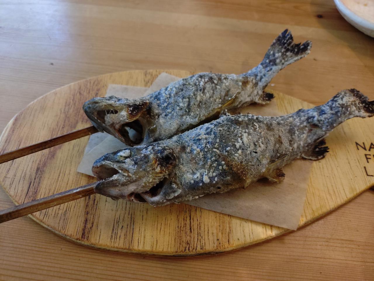 ラーメンとかもあったけど、釣った魚と塩むすびでランチ。那須フィッシュランド キャンプ場