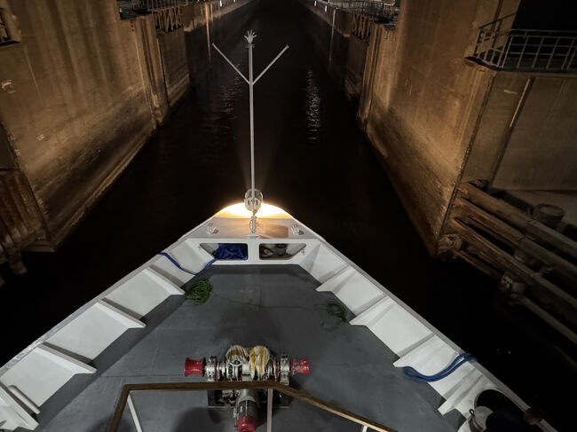 閉じられた水門内部で水位が上昇し水位調整後、クルーズ船通過。