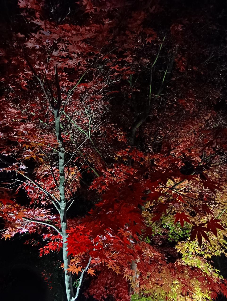 大きくて葉がたくさん残っている真っ赤な紅葉木にライトの当たり方が最高の状態です!まさに幻想的な夢の世界で何の言葉も出ません!