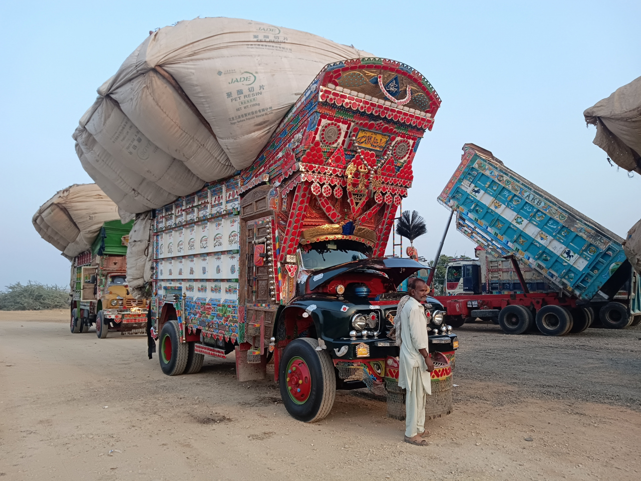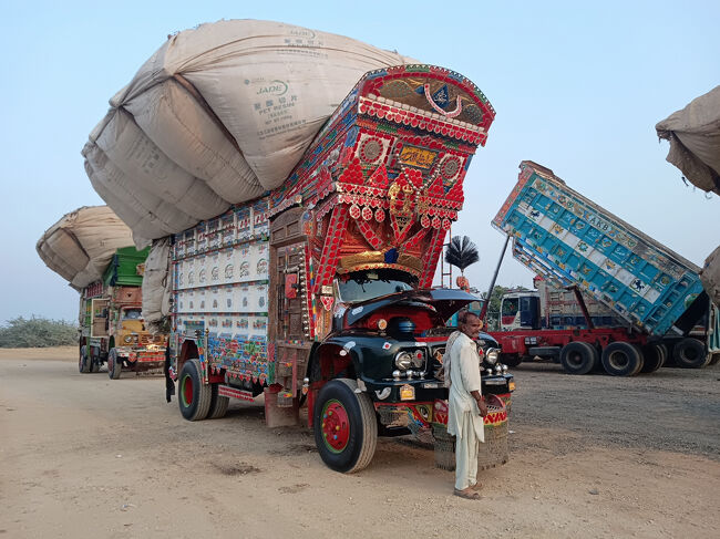 荷台をはみ出して積まれているのは穀物、もみ殻や藁のようで、カラチなどの飼料工場へと運ぶとのこと。 -