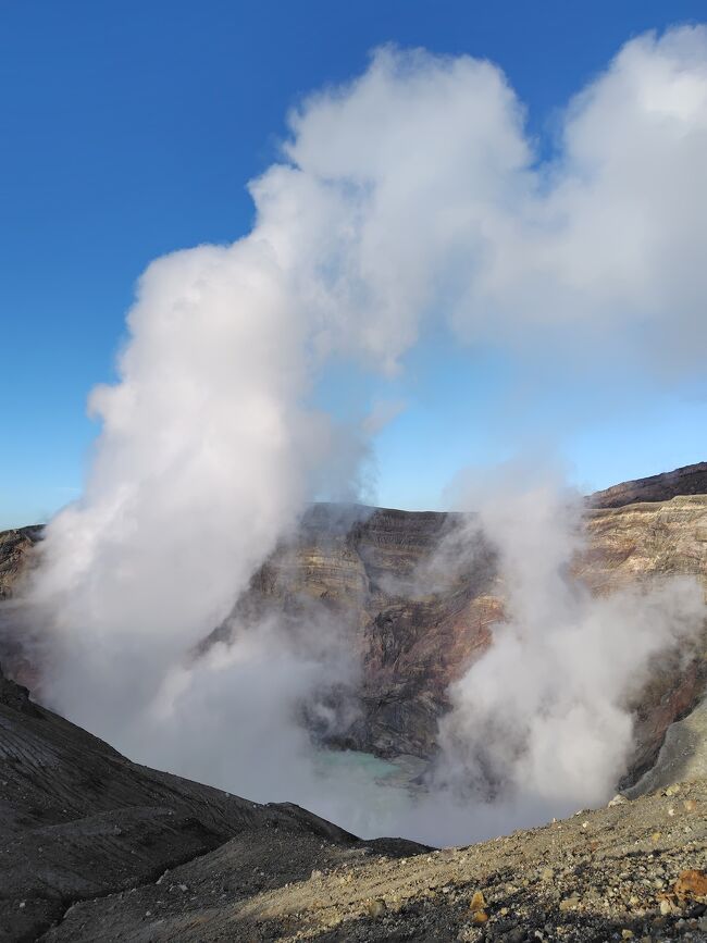 やっぱり真近で見る沸き出る白煙と硫黄の匂いのする噴火口は迫力満点だった。火口の煙の中で時々見える「湯溜まり」はなんとも言えないきれいなうすあおみどり色で神秘的ですらあった。来てみてよかった。幸運だった。