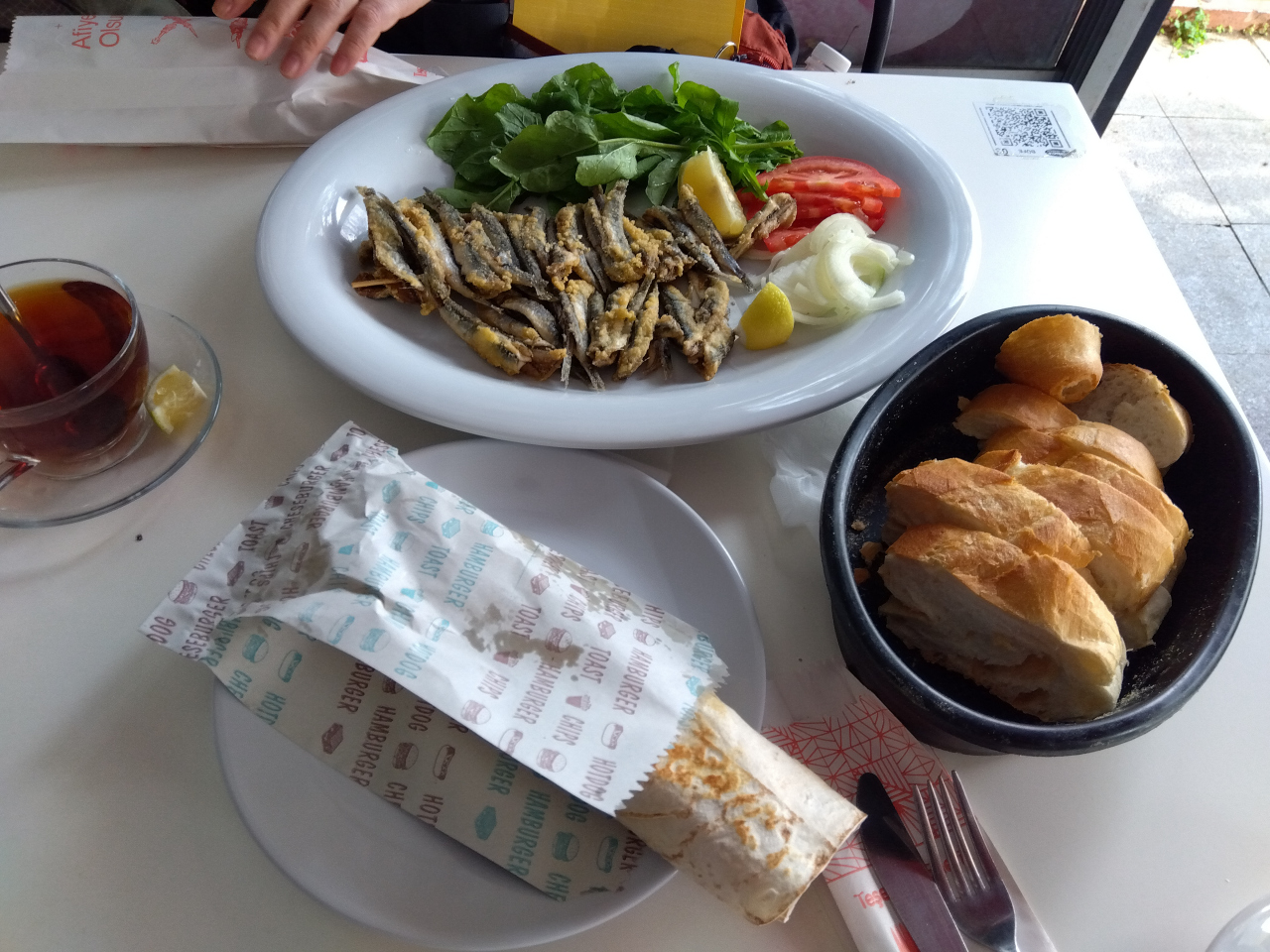 シーフードが食べたかったので、小魚のフライと鯖サンドならぬ鯖ロールを頼みました。魚料理を頼むとネコちゃんがやってくるのはご愛敬です。この時やってきたネコは積極的に膝まで登ってこようとしたので驚きました。