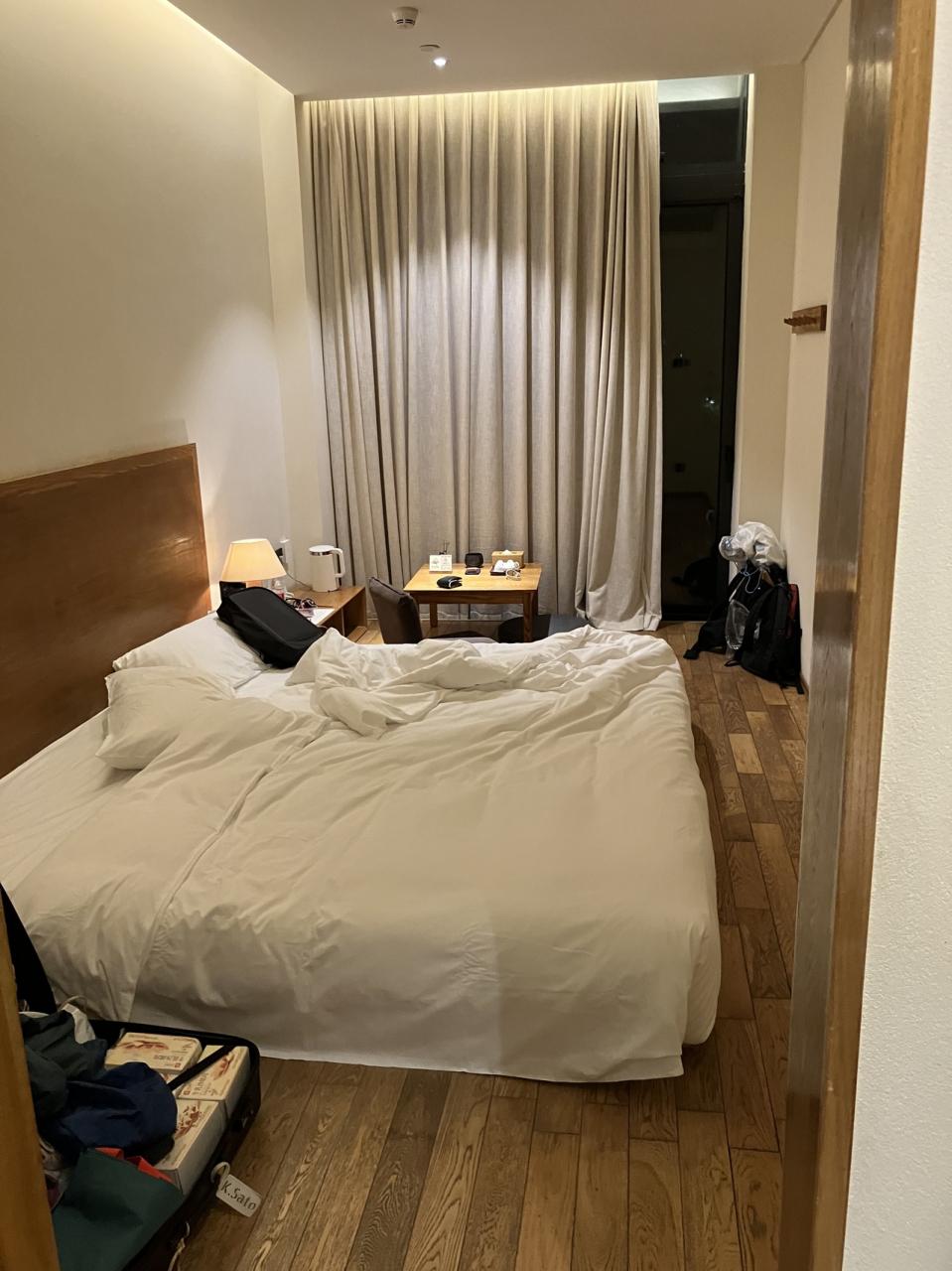 散らけた後だけどホテルの部屋。テレビと時計がない。テレビはネット配信をスマホで見ればいいけど、目覚まし時計は欲しかったなあ。まあこれもスマホでなんとかなったけど。