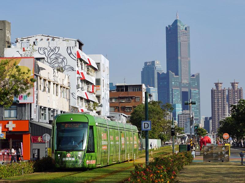 85階建ての超高層ビル、高雄85を背に芝生軌道を行くLRT。停留所間はバッテリーを電源に走行するため架線が無く、上空がすっきり。