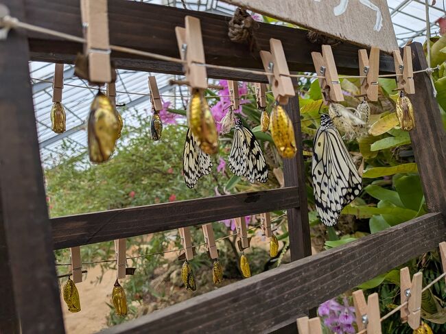 中でも蝶々園の中にはオオゴマダラの金色の蛹が洗濯バサミでぶら下がっていて、羽化したばかりのオオゴマダラが羽を休めていて、思わずこれ本物?と訝しんでしまった。