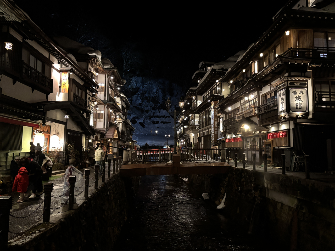 後ろに雪山、両脇に小さな温泉宿がびっしりと並ぶ、見渡せる位の広さの温泉街、銀山温泉。