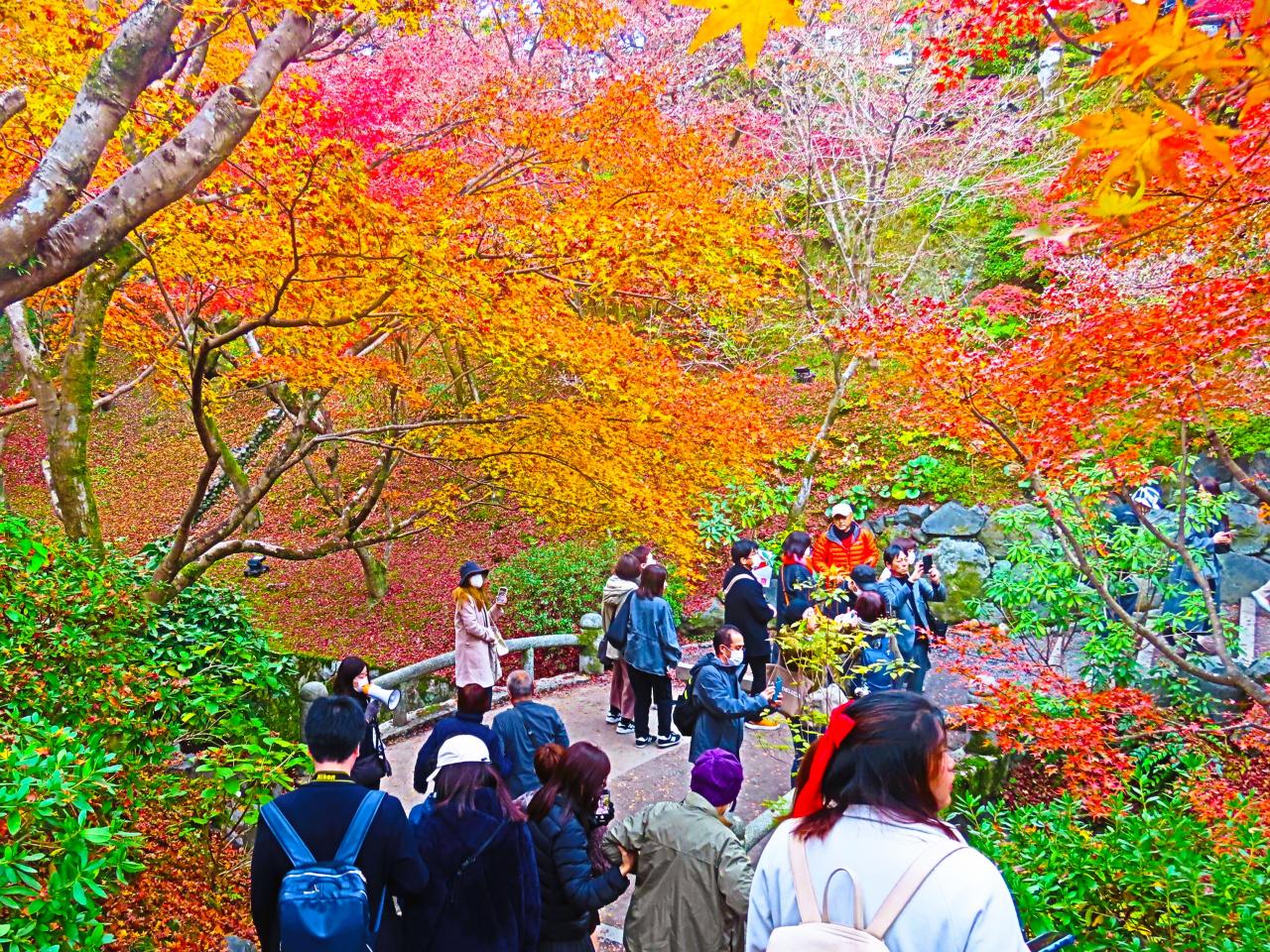東福寺の「洗玉澗」(せんぎょくかん)とは、東福寺境内を流れる渓谷のこと。その上を通天橋などの橋が架かり、「通天もみじ」が渓谷全体を覆い尽くす「紅葉の雲海」が絶景として有名。この渓谷は、谷水が岩に当たり玉のように輝く様子から名付けられ、深山のような景色を楽しめる。