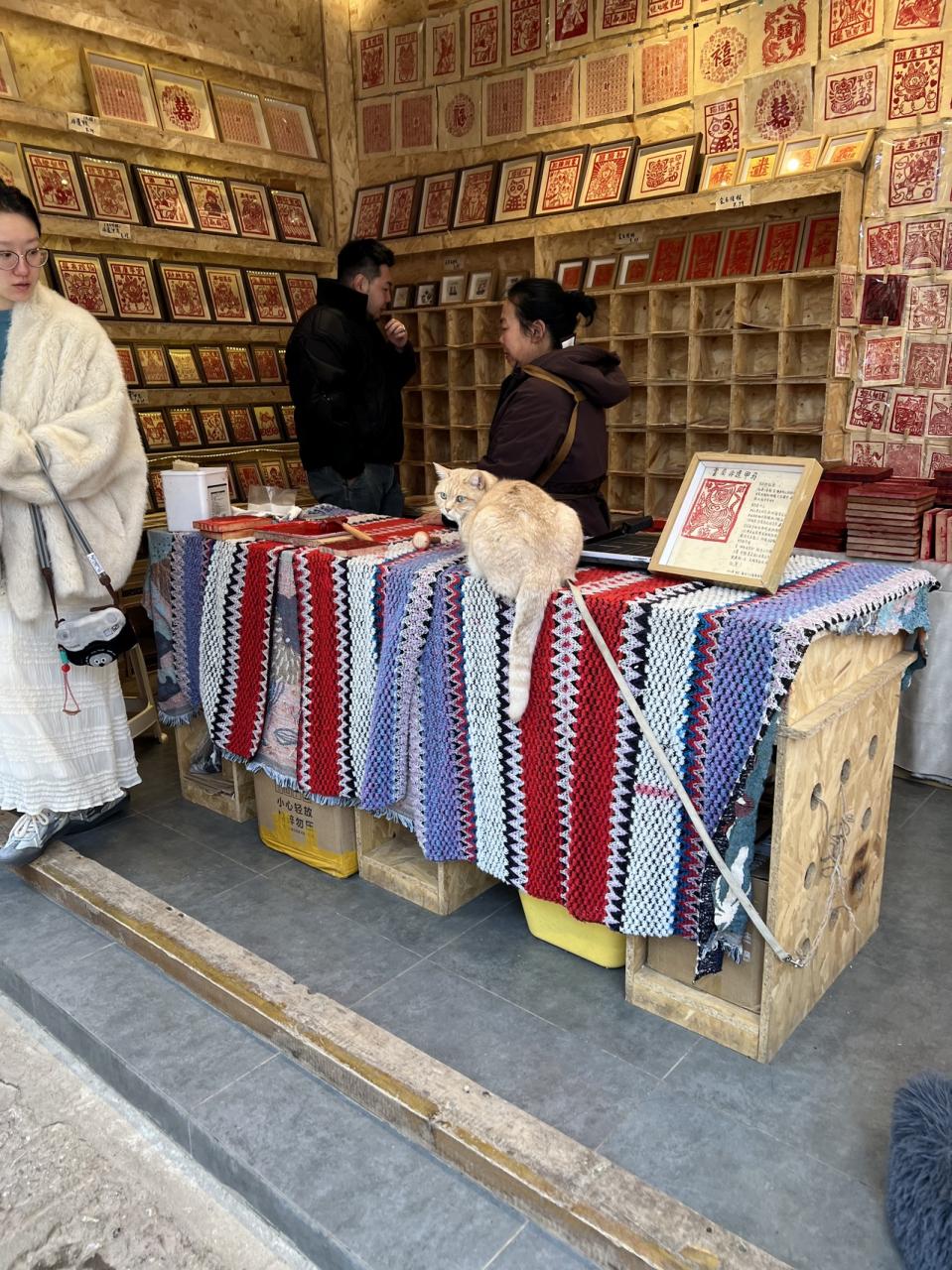 猫は守り神ということで、あちらこちらに猫をモチーフにしたアイテムが売られています。店先でも看板ネコちゃんやワンコがたくさんお迎えしてくれます。