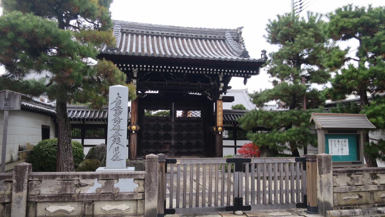 日蓮宗京都八本山の一つで、室町時代の1477年、日意(12世)が師・日朝の命により創建し、関西の信者が山梨の身延山まで参詣する不便を思い、宗祖・日蓮の御真骨を分骨・奉安し、同時に身延七面山(しちめんさん)に勧請されている七面天女の霊体を安置した。山門前に「日蓮上人御分骨之道場」の石碑がある -