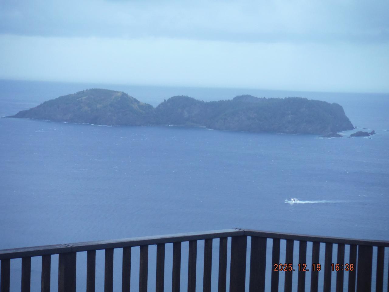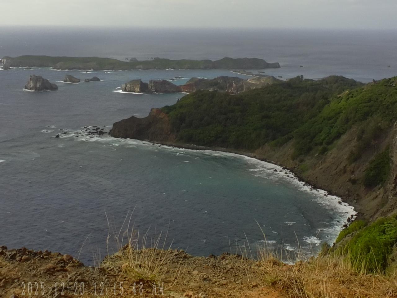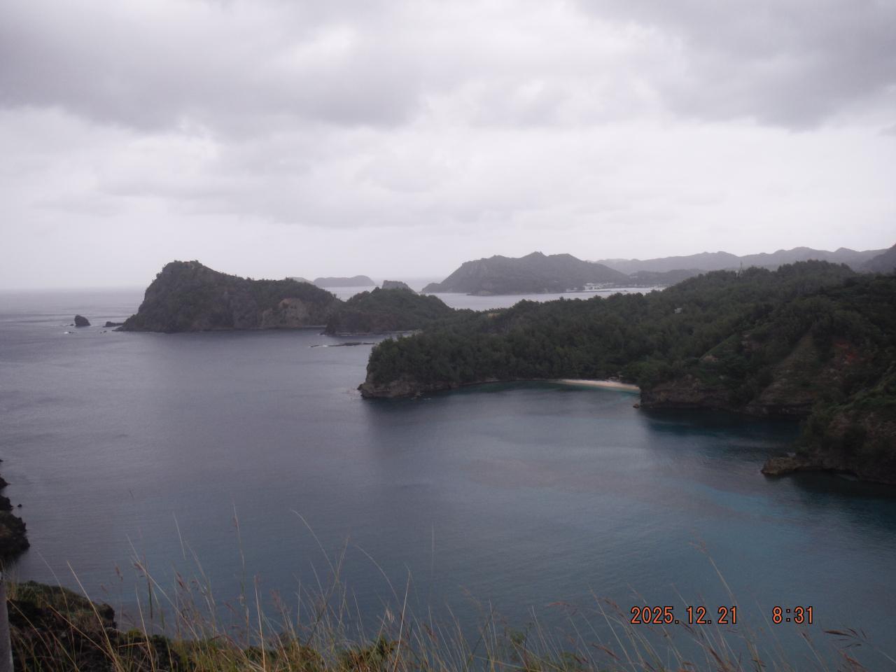 三日月山展望台から東島を見下ろします。父島の西側の海を望む展望台で、水平線に沈む夕日は雄大だそうです。しかし雲が厚いのでギブアップして宿のアクアに戻りました。