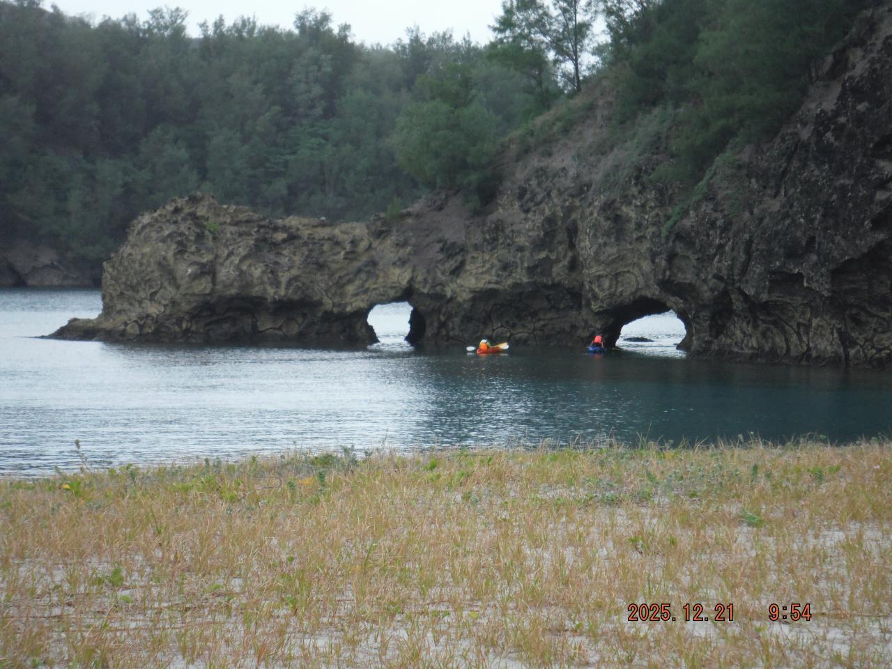 ツアーのカヌーは洞窟の前で停泊しています。結局洞窟には入らないで岩壁沿いを進んでました。小港海岸は夜の星空日本一に選ばれたそうです。とても波が穏やかでまるで湖面のように自分の姿が水面に映るそうです。