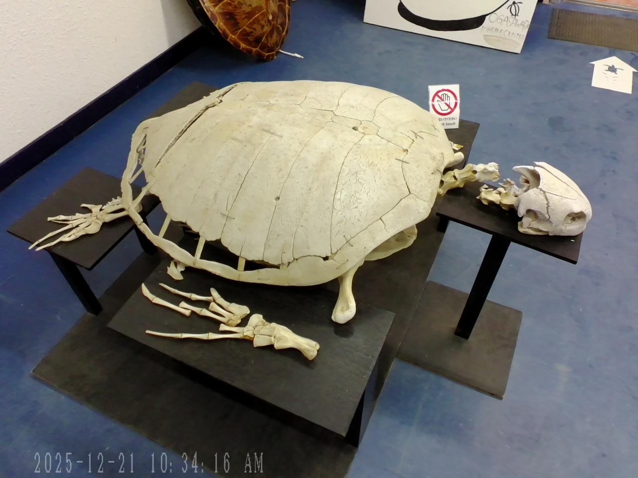 村営バスで戻り途中の小笠原海洋センターに立ち寄りました。小笠原の海に多く生息するウミガメについて研究を行っている施設です。無料で入場できます。亀の甲羅は骨とつながっているのですね。