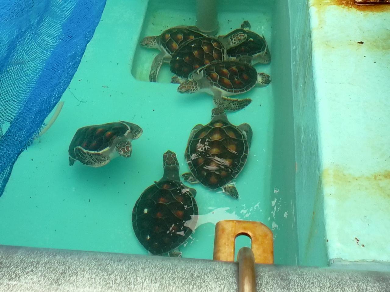 外の水槽にアオウミガメの子供が多く泳いでいます。タイミングが良ければこの中からお金を払ってウミガメを選んで海へ放流できるそうです。1年間飼育して大きく育ったカメはふ化したばかりより生存率がよくなるからここで泳がせているのですね。