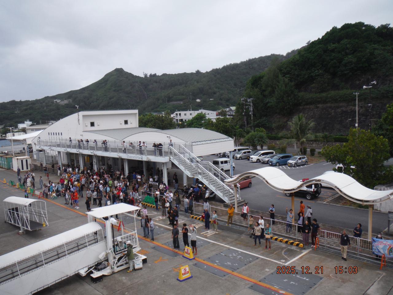 父島二見港を15:00発おがさわら丸で出港しました。島の方のお見送りはエンタメでした。島太鼓で航海安全を祈ってくれるところから始まり、港にいる観光に携わる方々からの声掛け、アクアのご夫婦、ツアー会社の方々。船が出てからツアー会社の方は自社のツアーボードで船を追いかけ、最後に若手のガイドさんが飛び込んでお見送りしていただきました。