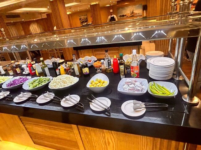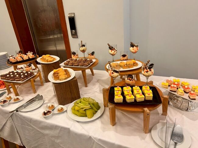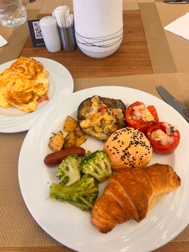 食事は三食ともビッフェスタイルです。朝はみなさんオムレツや目玉焼き等を使ってもらっていました。また個包装のヨーグルトにフルーツを入れたり、個包装のバターをパンに塗って食べていました。牛乳やアーモンドミルクはピッチャーに入っていました。娘はコーヒーに入れて飲んでいましたが大丈夫でした。