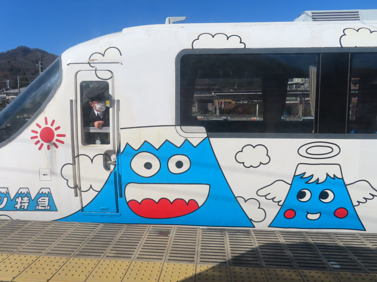 どこ駅だったか、茶色いレトロふうのカラーの車両が。調べると「富士登山電車」で旧京王5000系電車を使ってます。