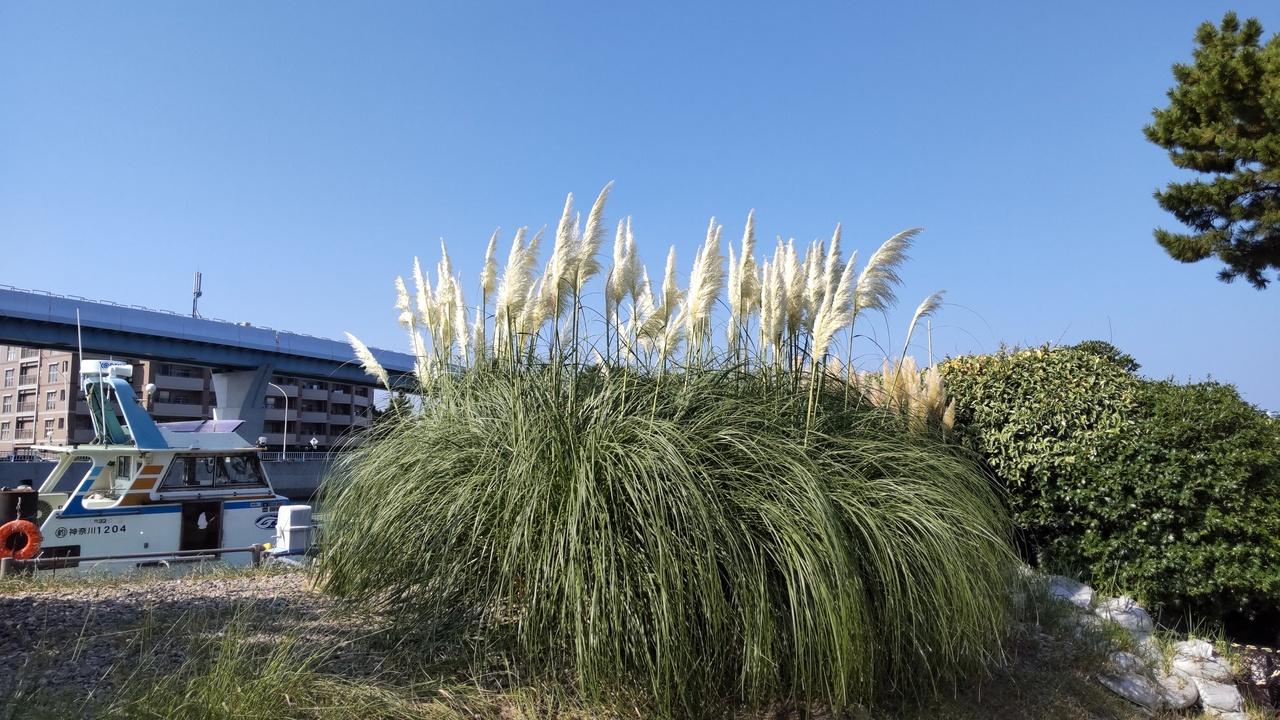 快晴の野島運河側の良く手入れされた花壇に、すすきではなく、南米原産の「パンパスグラス」が秋になる前に開花。海の公園へ向かいましょう。野島公園 公園・植物園