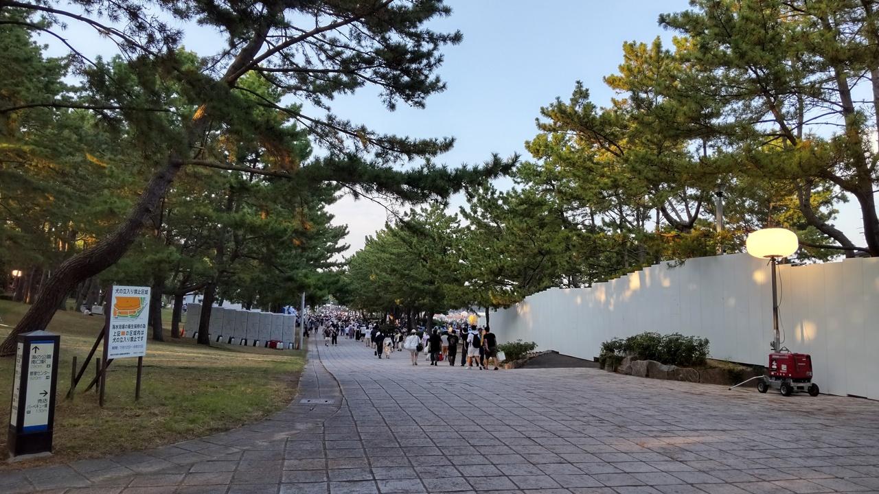年に1度の金沢まつり花火大会へ大勢の人が集まってきて混雑し始めた。右手の白壁は花火大会の通行を規制するための仮設ではなく、海の公園へ移築された文化財の「旧長濱検疫所一号停留所」を囲ったもの。