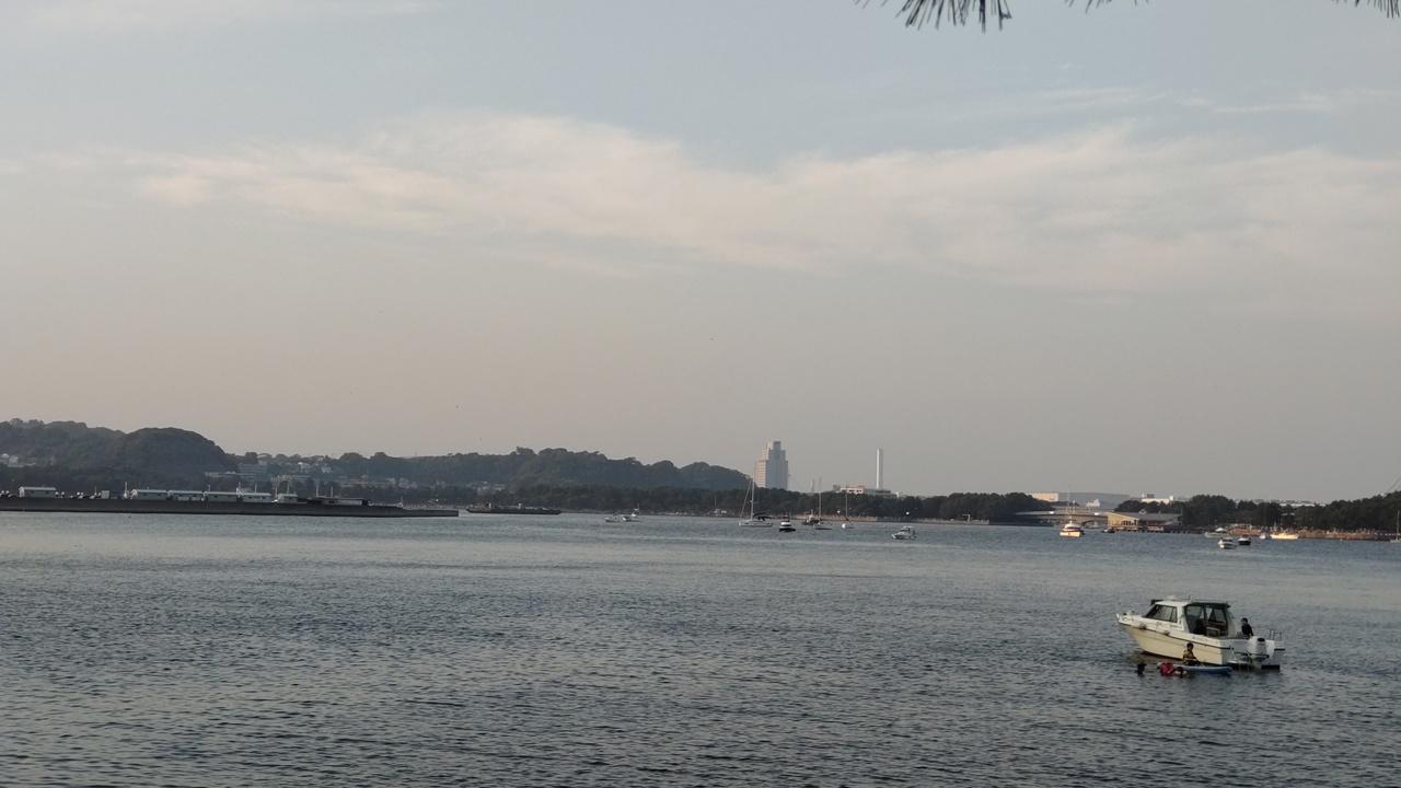 左手に海の公園から八景島、右手は夏島、住友重機械等の工場群、中央の金沢湾の狭い湾口から、東京湾対岸の内房君津辺り。