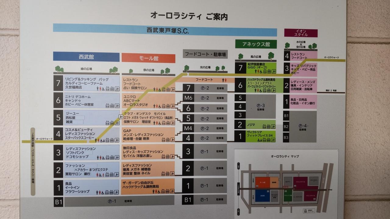 昨年に来店頻度が増した、JR東戸塚駅の東側に隣接する西武東戸塚店がキーテナントのオーロラモールのフロア構成。傾斜地の立地なので階層構成がやや複雑。