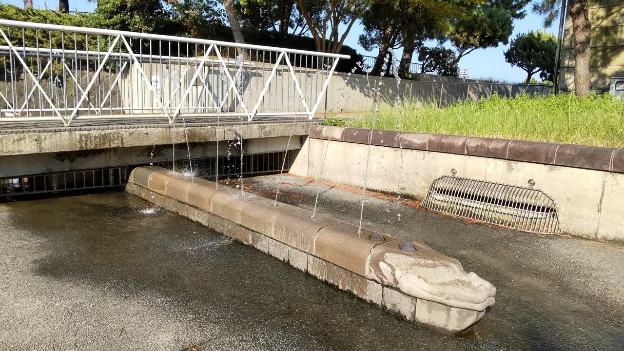 猛暑の土日、時間限定で海の公園に噴水が現れる。公園の噴水としては小規模で派手さは無いものの、ドラゴンの背からの噴水は独特。どこかに兄弟がいる?
