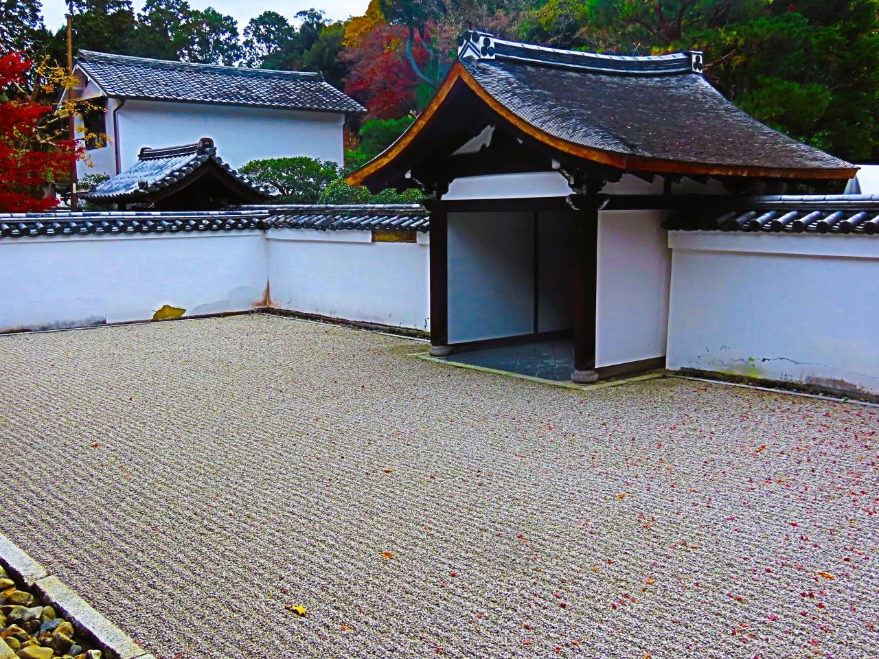 南庭は「無の庭」と名づけられ、白砂を敷きつめただけ。南庭は儀式の場であったことから、このように空間をあけるのが正式なつくり方。