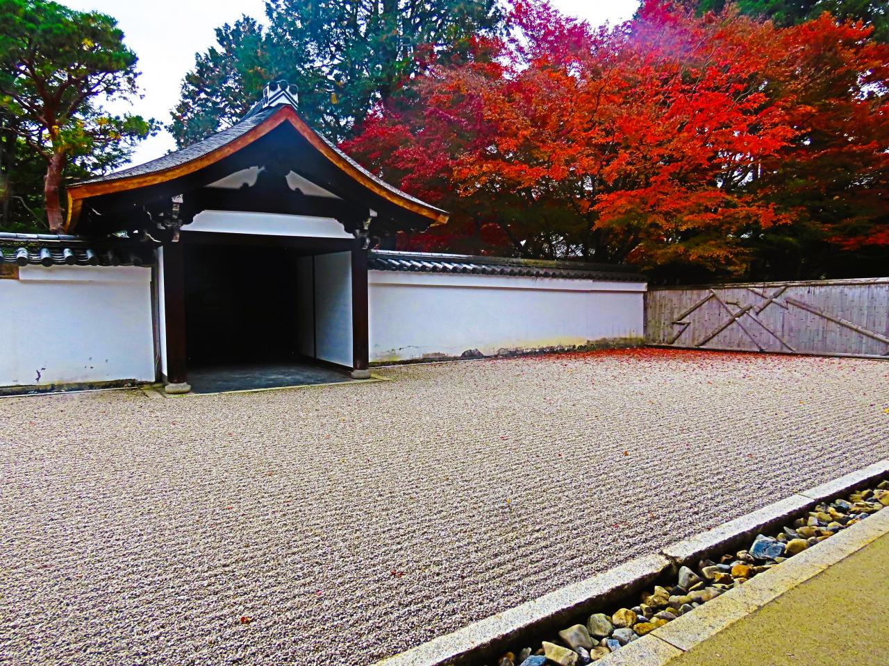 国宝の方丈は、日本最古の方丈建築であり書院造と寝殿造が融合した優美な建物。方丈の周りには、昭和の作庭家・重森三玲による「無の庭」「不離の庭」「龍の庭」という個性的な枯山水があり、竹垣は珍しい稲妻模様をしている。