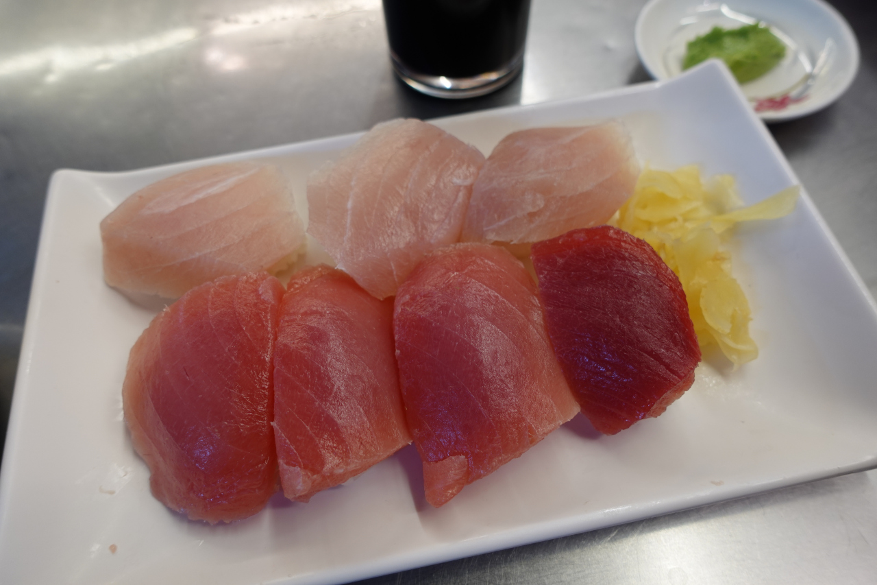 半旗半鮪。小は7顆、7貫って事ですが、半々ってどないかなと。少し残念ながら、鮪の方が4貫ですね。期待は旗魚の方やってんけど
