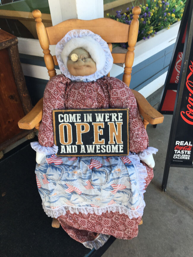 お店の入り口では、グランマの人形がロッキングチェアに腰掛けています。