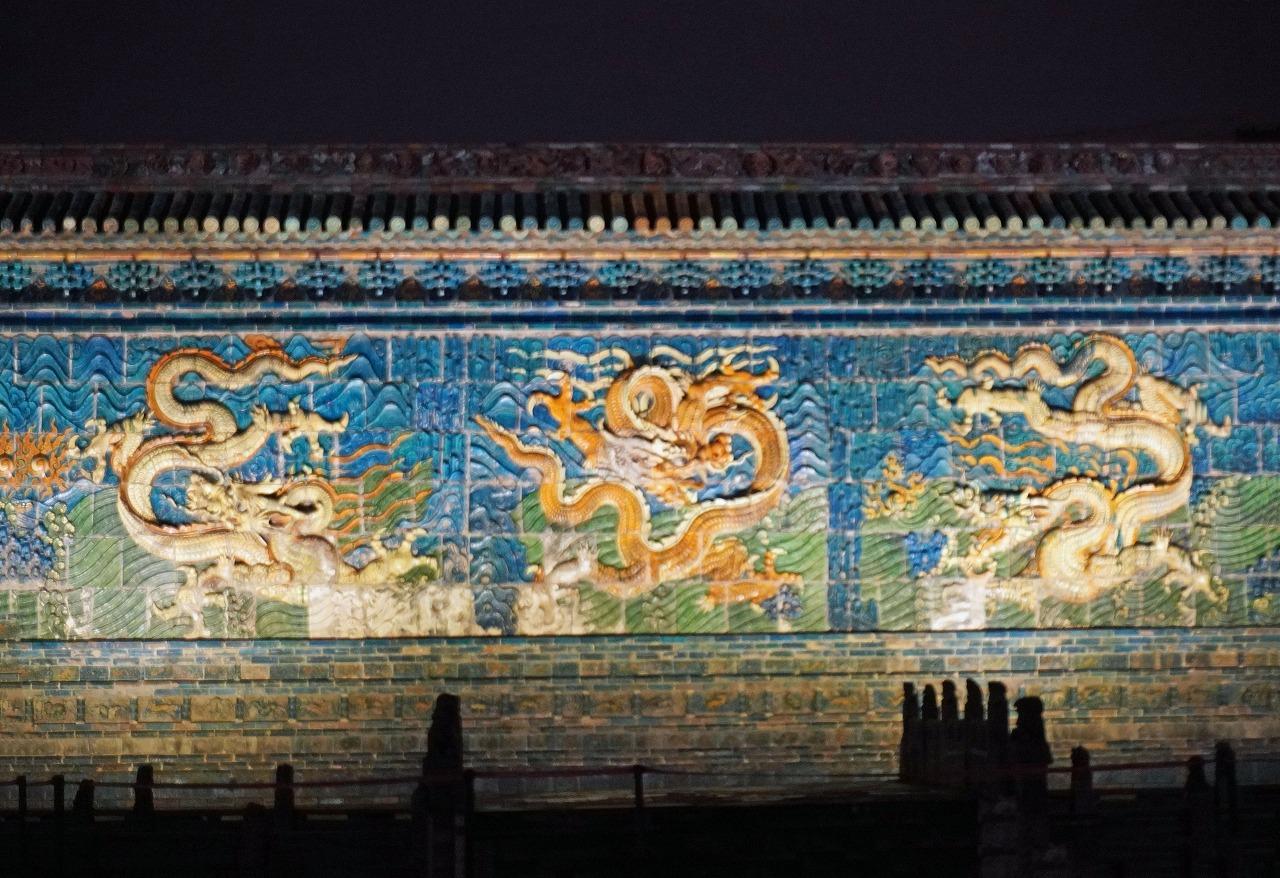 全長45.5メートル、高さ8メートルの巨大な壁には色鮮やかな琉璃瓦で九頭の龍が躍動的に描かれており、雲や波などの装飾も精緻です。