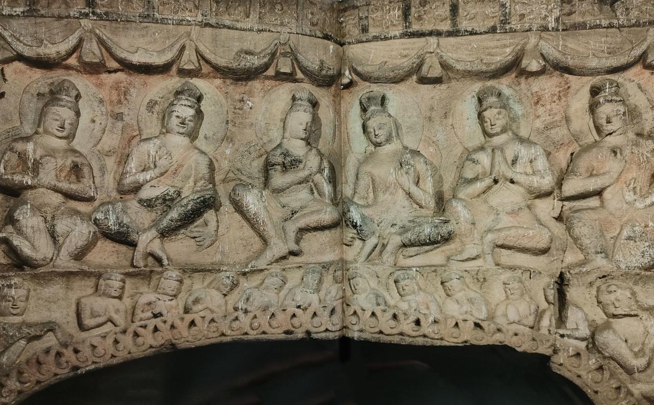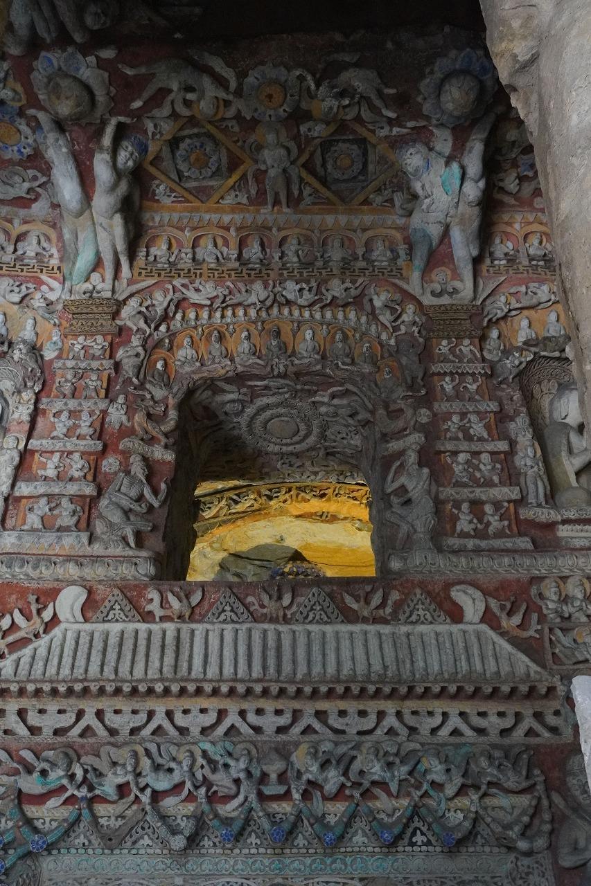 洞への入り口のゲートにも隙間なく壁龕と小さな仏が彫り込まれてあります。わずかに彩色もの固定るように感じることから往時はどれほどの極彩色の世界だったのでしょう。