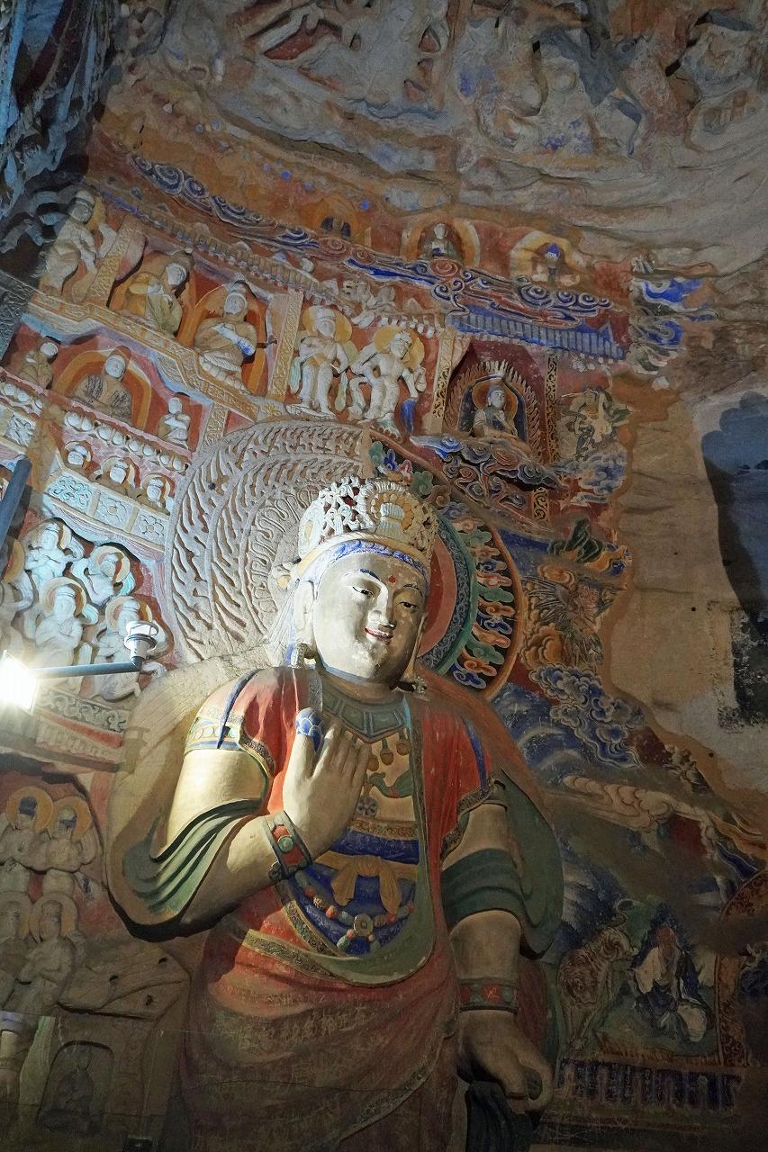 北壁の主仏は高さ16.8メートルで「雲崗石窟」における第2の大仏です。主仏は北方不空成就仏で「蓮華三昧経」によると釈尊と異名同体であると言われます。密教では金剛界の五知如来とされ、北方は涅槃位に当たるとされます。この像には脇侍の仏が無いのは交脚が大きすぎて掘るスペースが無かったようです。