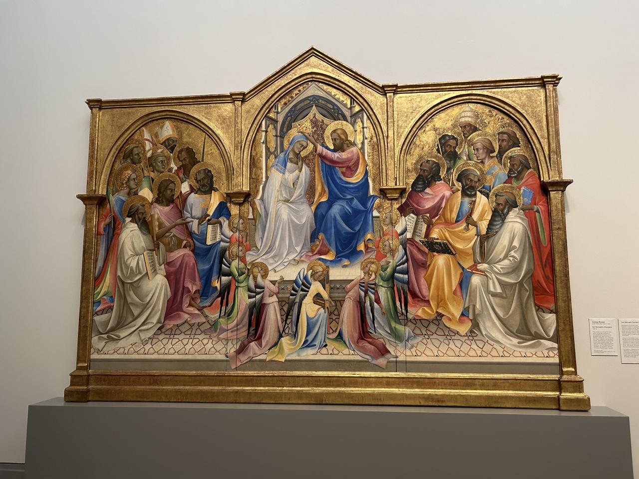 つい最近(2025年の5月)リニューアルされたナショナルギャラリーのセインズベリー棟(Sainsbury Wing)の内部の様子。上から13世紀頃に作られた十字架が吊り下げられていた。
