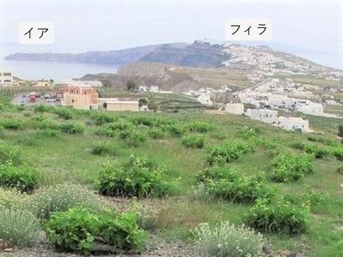 ピルゴスのホテルの前からフィラとイアが見えます。手前はぶどう畑。