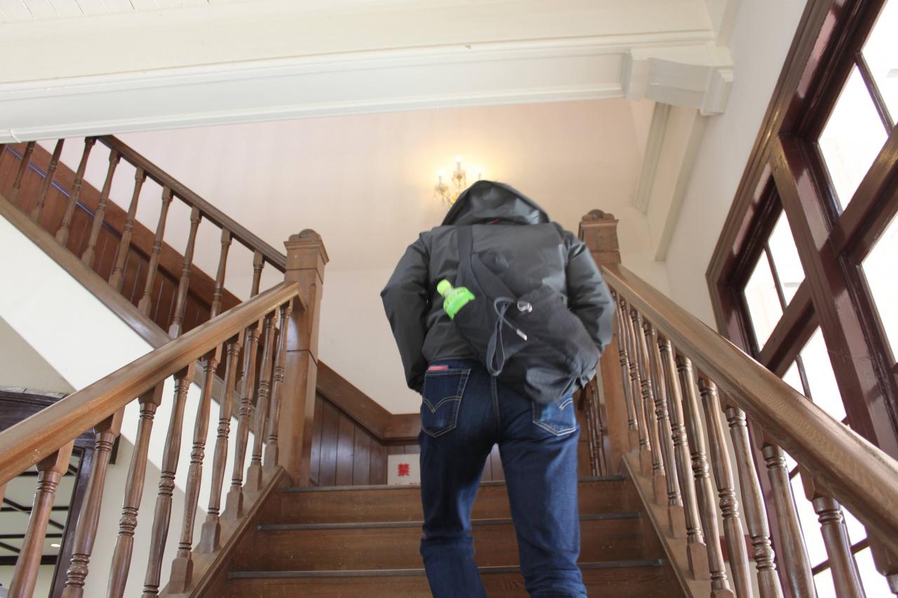 小雪に加えて、強風で舞い散る杉の葉を避けつつ、石段を登って行く