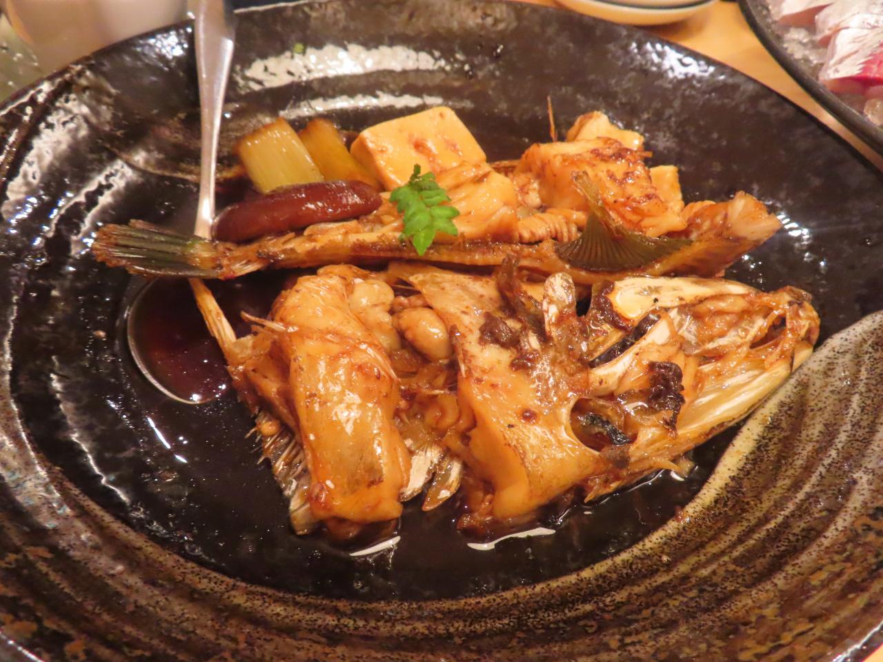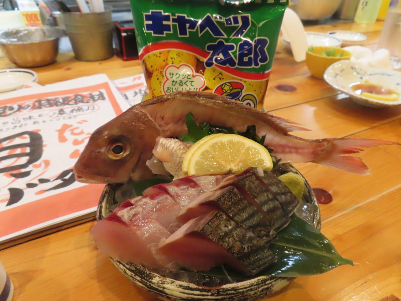ひとりなので、おとなしく「お造り三種の盛り合わせ(1200円)」を注文。ハツガツオに鰆に小鯛の姿造りでした。小鯛と言えば笹漬けばかりで、お刺身は生まれて初めていただきました。瀬戸内海にもいたんですね。