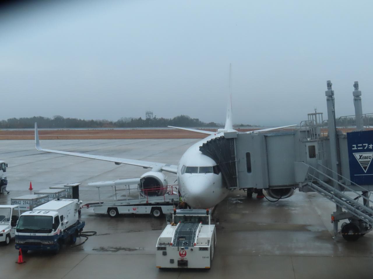 雨模様の広島空港。本日の機材はボーイング737-800。165席。