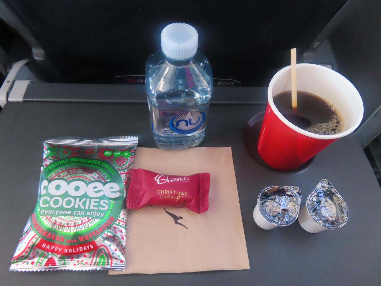 機内食は、クリスマス仕様のジンジャークッキーにチョコレート。