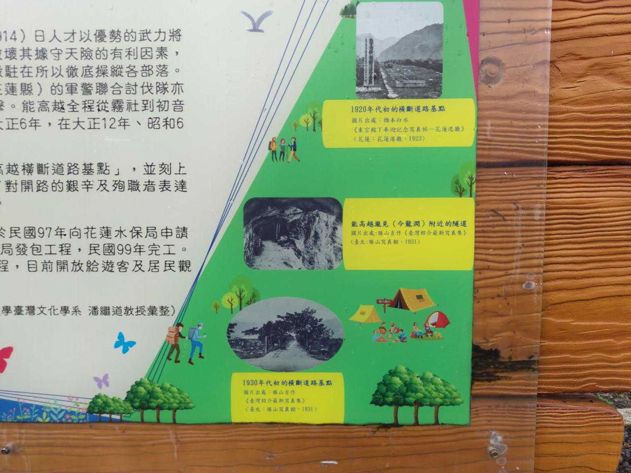 上の看板のアップ。これはかなり簡略化された地図で、能高越嶺道はこれでもかというつづら折りの道です。日本時代、この道の探索にあたり全滅した(原因は諸説あり)深堀大尉の隊については、南投側から出発する様子が映画「セデック・バレ」にも登場するそうです。