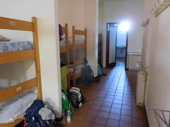 他のベッドは次の写真ですが、平ベッドはこの左奥にあり、右側にも同じ構成でベッドがズラッとあります。全部で150ベッドもある大型アルベルゲです。正面に明るくなっている部屋はトイレとシャワールームです。