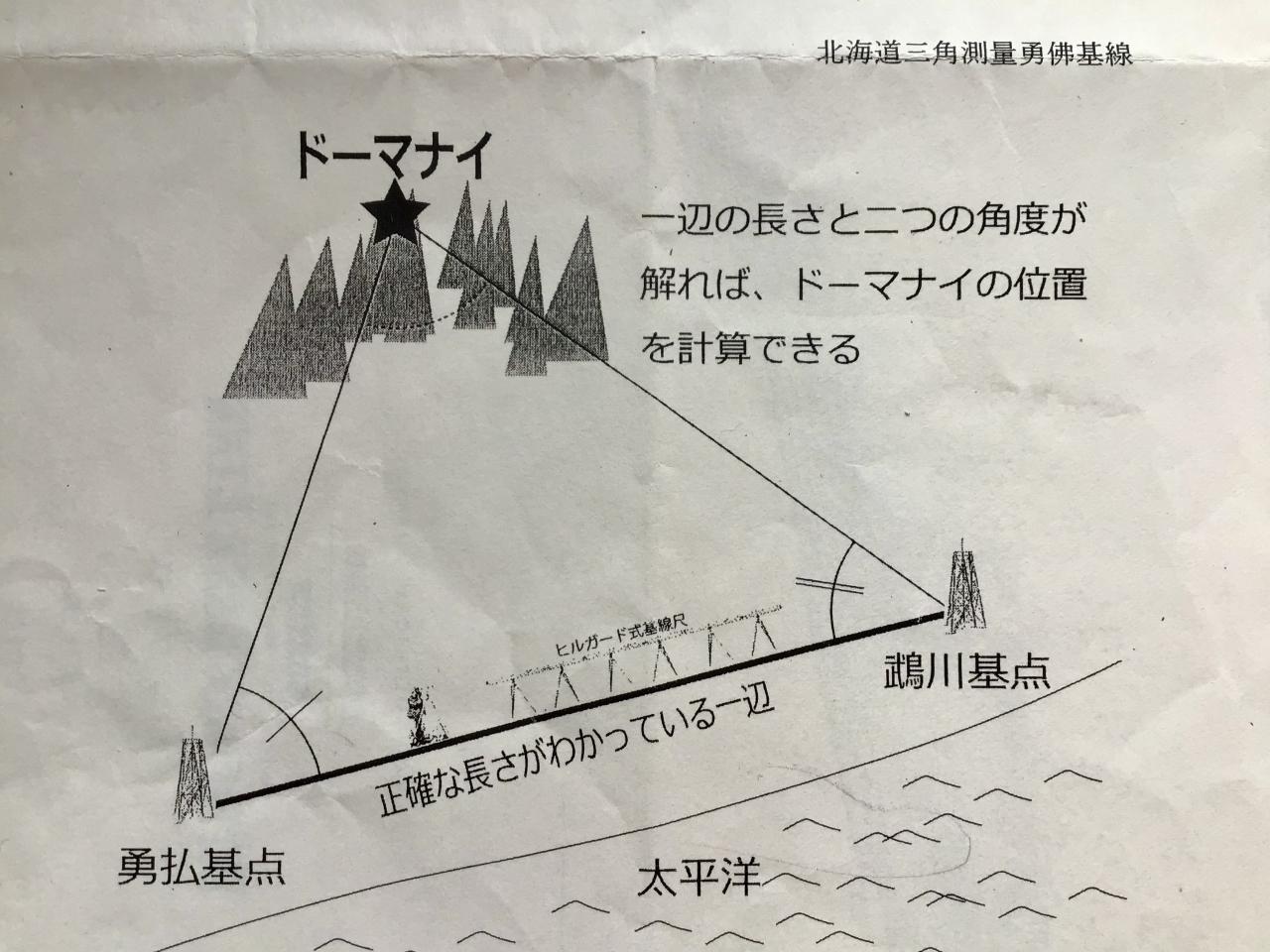 三角測量とは 三角形の原理を利用して他の点までの距離を計算する方法で、この基点から全道に三角網が広がり、北は稚内利尻島から道南まで北海道の約5分の2をカバーした。1965(昭和40)年、勇払基線を形成するもう一方の鵡川基点発見のため、国土地理院も参加して発掘したが発見には至っていない。