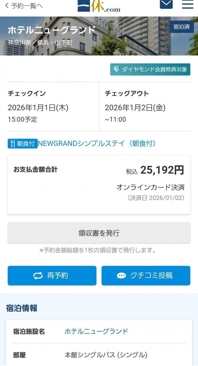 ホテルニューグランド宿泊2026年1月1日